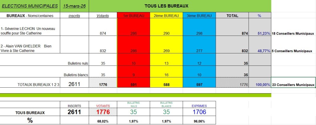 La litse "Un nouveau souffle pour Sainte-Catherine", emmenée par Séverine LECHON, l'emporte avec 874 voix contre 832 voix pour la litse "Bien Vivre à...